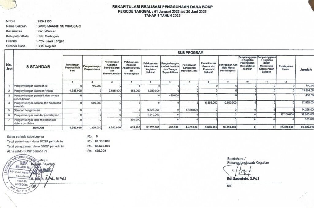 Rekapitulasi Realisasi Penggunaan Dana BOSPPeriode Tanggal: 01 Januari 2025 s/d 30 Juni 2025 16 Oktober 2025 oleh BOB
